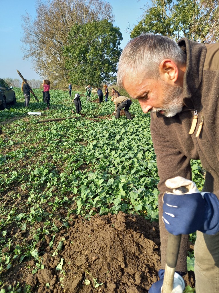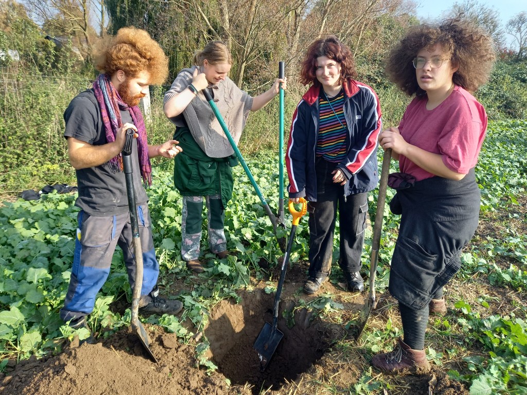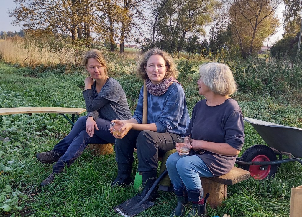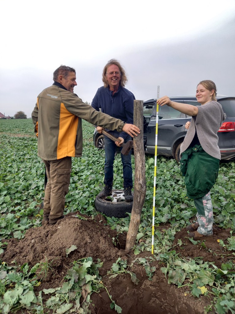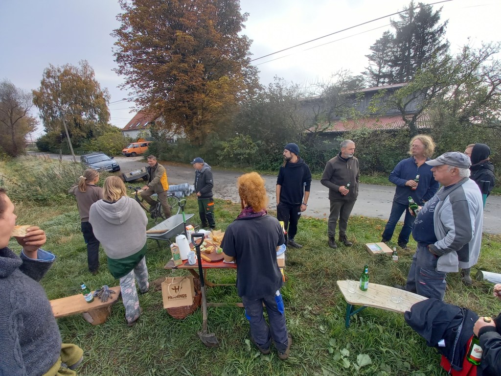 Überwältigend ist das Ergebnis: ca. 20 Leute, in 4-6 Kleinteams, 50 Pflanzlöcher, 200 Pfahllöcher und natürlich genauso viele Pfähle, Kuchen, Stullen, können wir bilanzieren. Haben also schon etwa 25 Kubikmeter Erde bewegt, um unseren ersten 50 Obst- Bäume am kommenden Wochenende ein gutes Bett vorzubereiten.