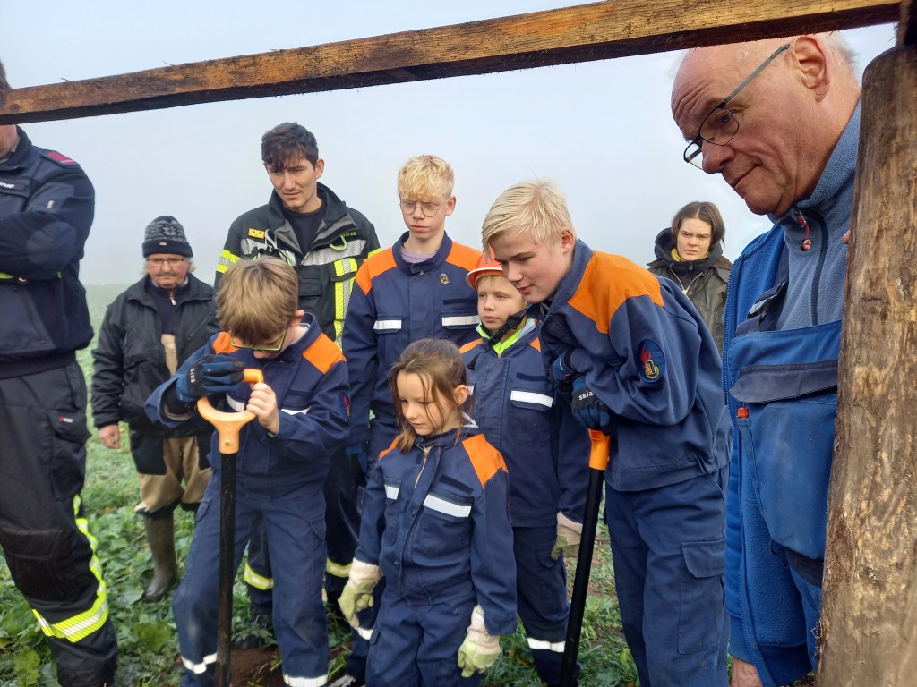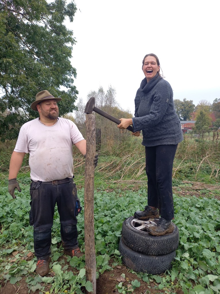 43 Pflanzlöcher wurden gebuddelt und zu jedem die Zaunpfähle gesetzt. Es wurde Suppe überm Feuer gekocht, selbstgebackener Kuchen gebracht…und Getränke…