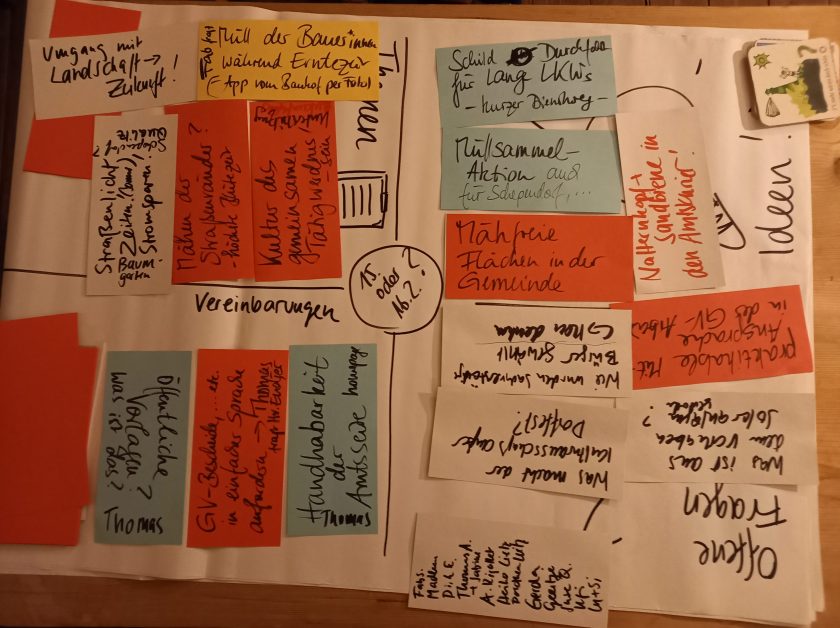 Hier entspannten sich mehrdimensionale Gespräche. Vorerst dienen die hier aufgeschriebenen Ideen, zusammen mit denen aus dem ersten Treffen ein Pool, aus dem alle schöpfen können. Welche Ideen zuerst angepackt werden, hängt von weiteren Gesprächen und möglicherweise folgenden Planungsschritten ab.